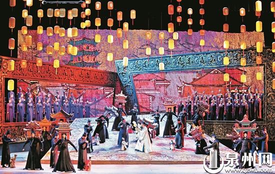 昨日,第四届海上丝绸之路国际艺术节在泉州大剧院隆重开幕。 开幕式后,紧扣海丝主题、凸显泉州特色的原创民族歌剧《大海承诺》精彩上演。图为歌剧《大海承诺》演出现场。(陈晓东 摄)