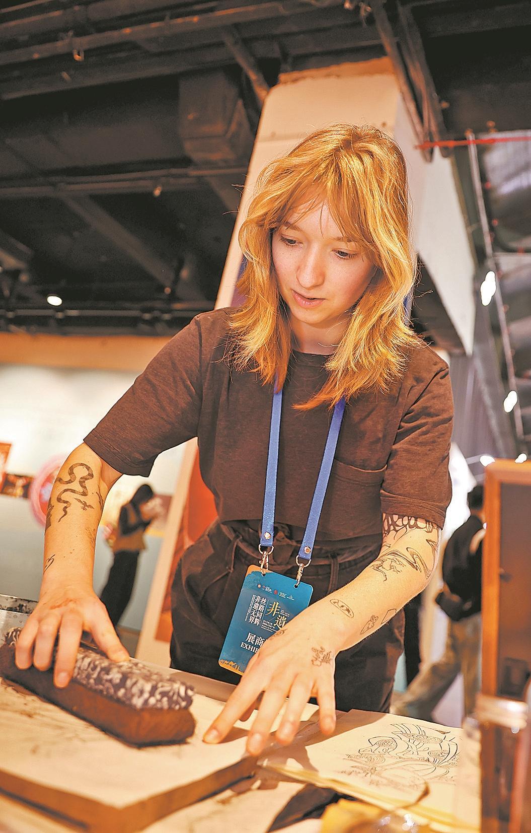 在四川绵竹年画摊位前,市民张女士把纸覆盖在刻好的木版上轻轻按压,使墨汁渗透到纸张中,一幅完整的图案就复制到纸上了。“一按一撕,一幅木版年画就完成了,这真的很神奇。”张女士一边展示她的作品一边感叹。